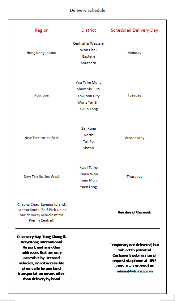 20. Delivery services will be scheduled on the day of the week (“Scheduled Delivery Day”) according to the districts where the delivery addresses are located, as shown in the Delivery Schedule (click link to see table). The schedule for each region, district or smaller districts will be updated from time to time without prior notice.